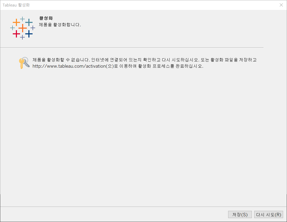 [그림 1] Tableau 활성화 창 라이센스를 입력하고 나면 [그림 2]와 같이 오프라인 상태이기 때문에 "제품을 활성화 할수 없습니다." 라고 나타난다. 하단에 있는 저장(S)를 클릭해서 offline.tlq 파일을 저장한다.