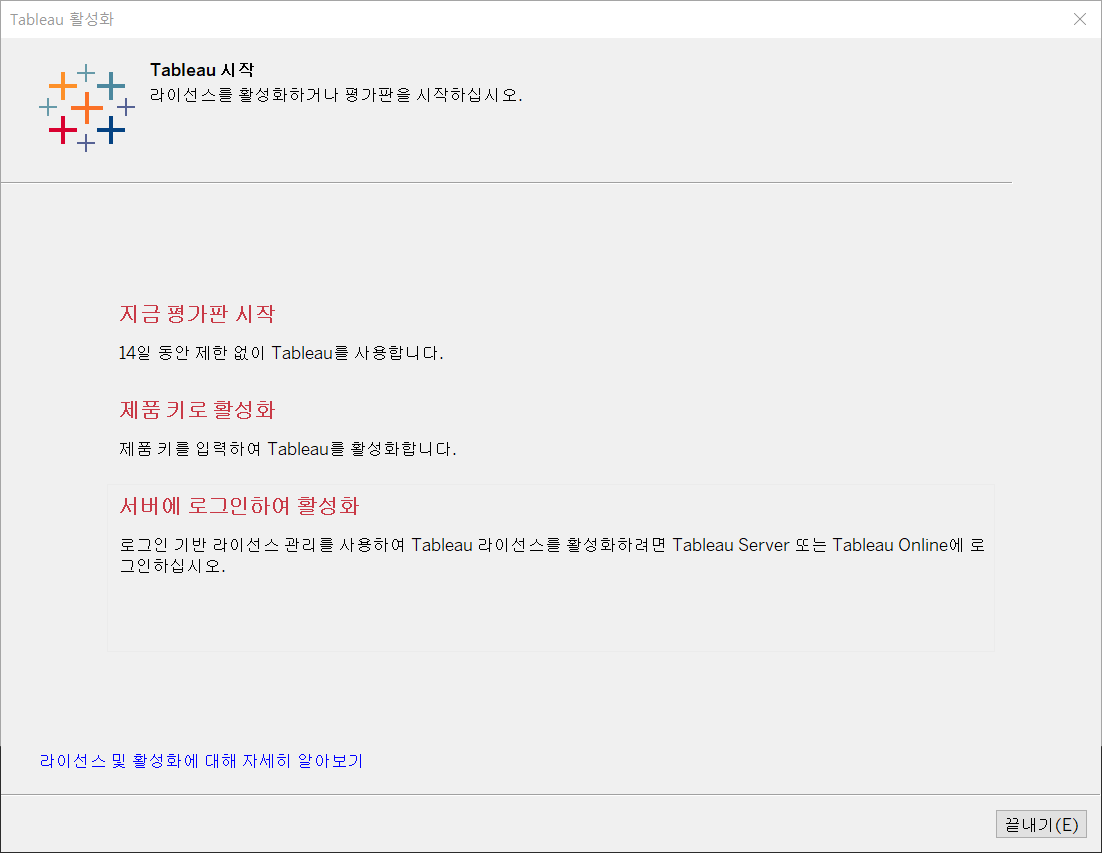 Tableau Desktop을 실행시켰을 때 라이센스가 비활성화인 상태일 경우 [그림 1]과 같이 Tableau 활성화 창이 나타난다. Tableau는 14일 동안 사용할 수 있도록 평가판을 제공하며, 만료가 될 경우 평가판을 사용할 수 없다. 라이센스를 활성화 하기 위해서 제품 키로 활성화를 클릭하고 구매한 라이센스를 입력한다.