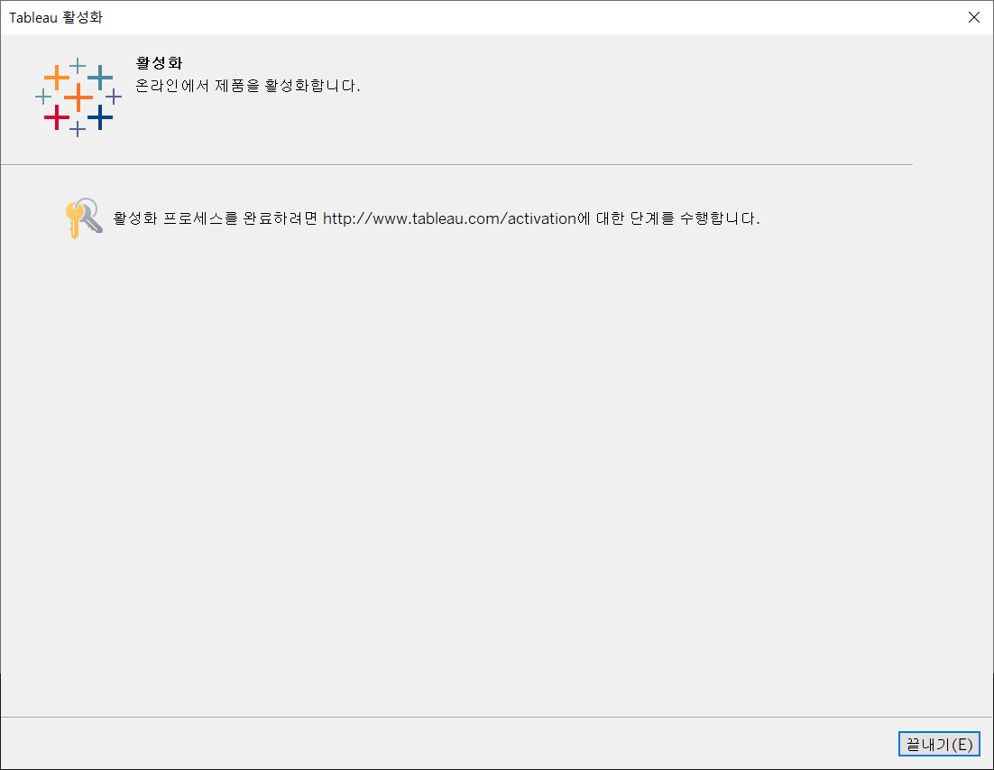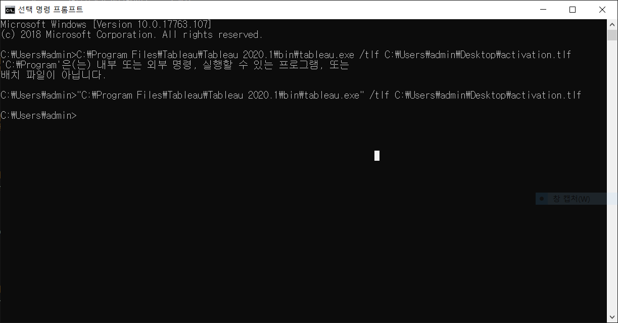실행 명령어 "C:\Program Files\Tableau\Tableau 2020.1\bin\tableau.exe" /tlf C:\Users\admin\Desktop\activation.tlf