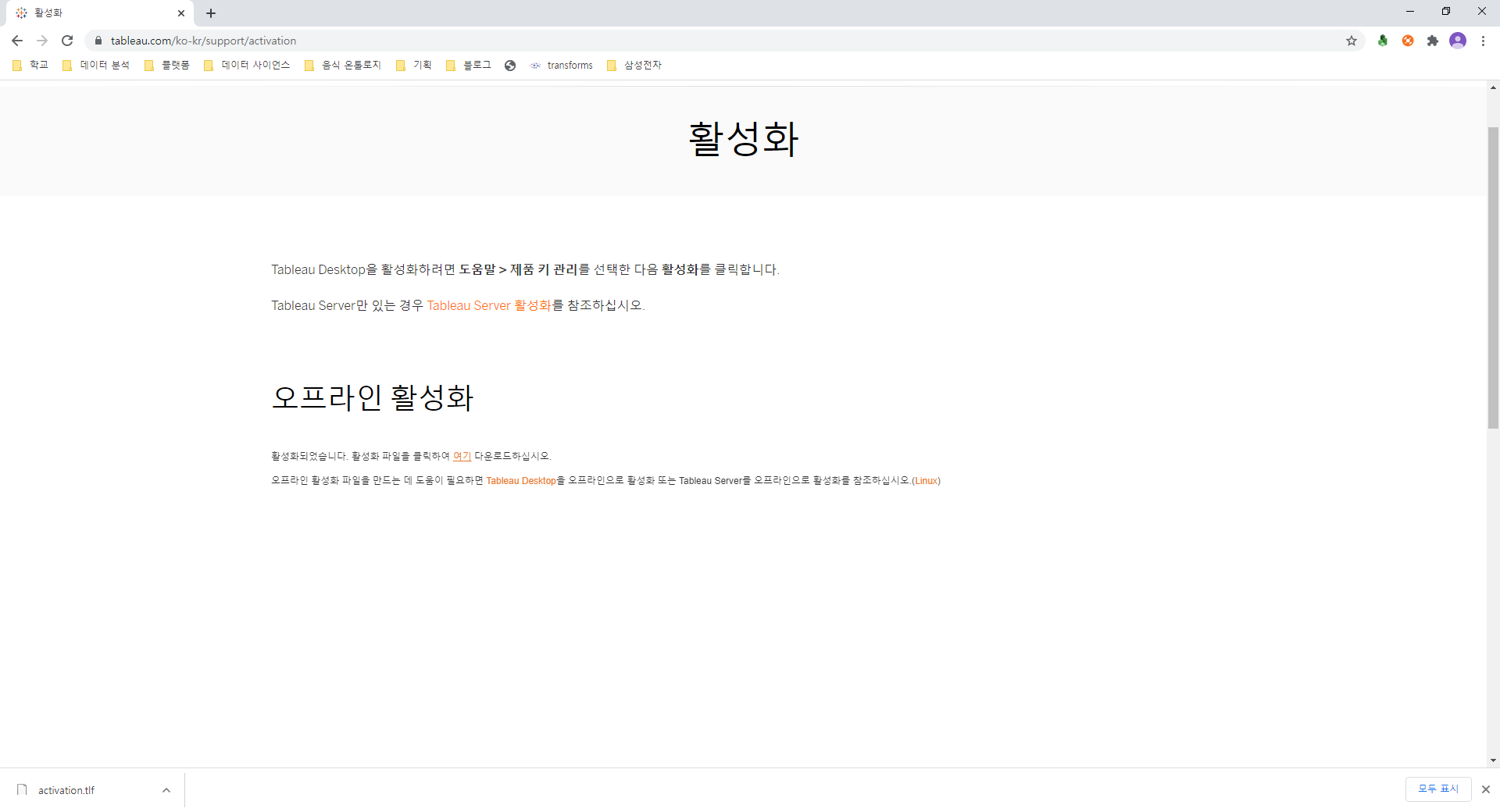 [그림 5] Tableau 공식 사이트 활성화 페이지 [그림 6]과 같이 오프라인 활성화 아래에 "활성화되었습니다. 활성화 파일을 클릭하여 여기 다운로드하십시오."의 여기를 클릭하고 activation.tlf 파일을 저장한다. activation.tlq 파일을 더블클릭해서 실행하면 정상적으로 활성화해서 Tableau를 사용할 수 있다.