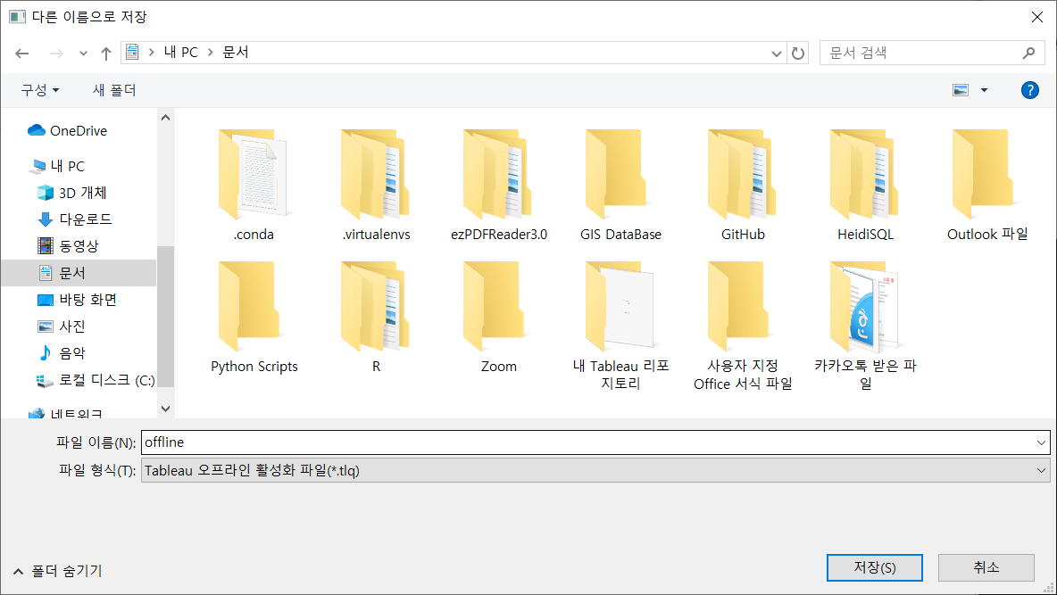 [그림 2] Tableau 활성화(Offline) [그림 3] 저장 화면 저장을 하고나면 [그림 4]와 같이 "http://www.tableau.com/activation"에 접속하여 다음 단계를 수행하라고 나타난다.