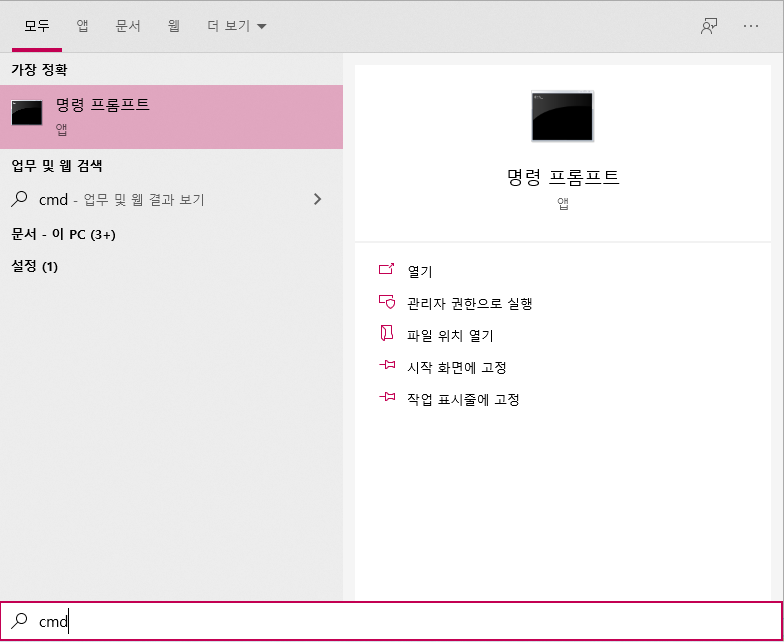 [그림 1] 시작에서 명령 프롬프트 검색 결과 Tabpy 설치 및 실행하기