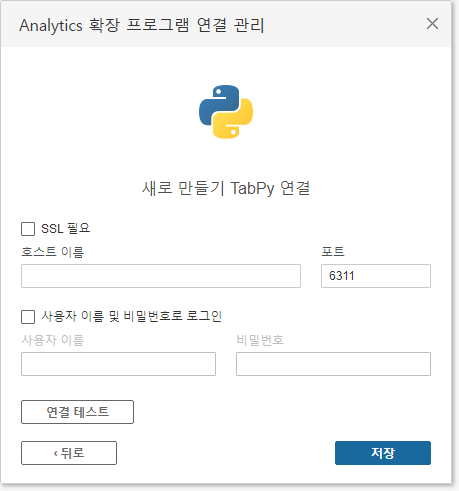태블로 데스크탑을 실행하고 메뉴탭에서 도움말(H) > 설정 및 성능(P) > Analytics 확장 프로그램 연결 관리(X) 순으로 선택하면 그림 3과 같은 화면이 나타난다. 호스트 이름, 포트를 입력하고 연결 테스트를 확인하면 tabpy서버와 태블로가 서로 연동되는 것을 확인할 수 있다.
