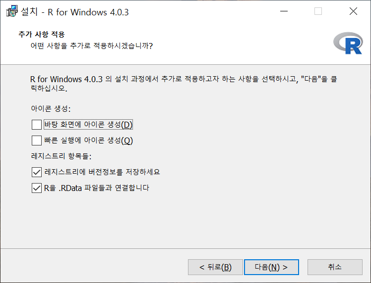 [그림 10] 스타트업 옵션 선택 화면 ⑤ 시작 메뉴 폴더에 바로 가기를 만들 수 있으며, 시작 메뉴에서 R을 실행시킬 수 있습니다. ‘다음(N)’을 클릭하여 넘어가면 추가 사항을 적용할 수 있습니다. 바 탕화면에 아이콘 생성이 필요할 경우 ‘바탕 화면에 아이콘 생성(D)’를 체크한 후 ‘다음(N)’을 클릭하여 넘어갑니다.
