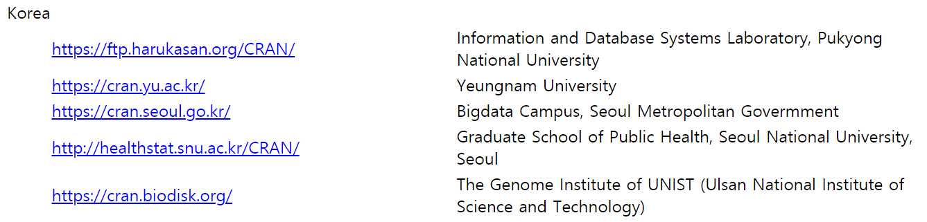 R 설치 파일은 R 공식 홈페이지의 CRAN Mirrors 페이지에서 다운로드 할 수 있습 니다. CRAN Mirrors 페이지는 지정된 국가별로 URL을 제공하고 있으며, 해당하는 국가 혹은 인접 국가의 페이지로 접속하여 다운로드 하는 것을 권장합니다.