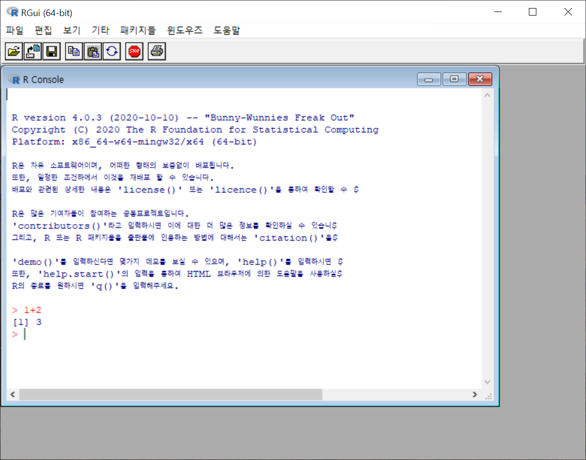 [그림 14] RGUI 실행 화면 ② 정상적으로 작동하는지 확인하기 위해 계산식을 입력해봅니다. 프롬프트(‘>’) 뒤에 1+2를 입력하고 엔터를 눌러 명령어를 실행합니다. 입력한 계산식 밑에 계산 결과가 출력되는 것을 확인할 수 있습니다.