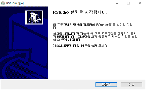 따라하기R 스튜디오 설치하기 ① 설치 파일을 더블 클릭하여 실행시키면 R 스튜디오 설치 화면이 나타납니다. ‘다음 >’을 클릭하여 넘어갑니다.