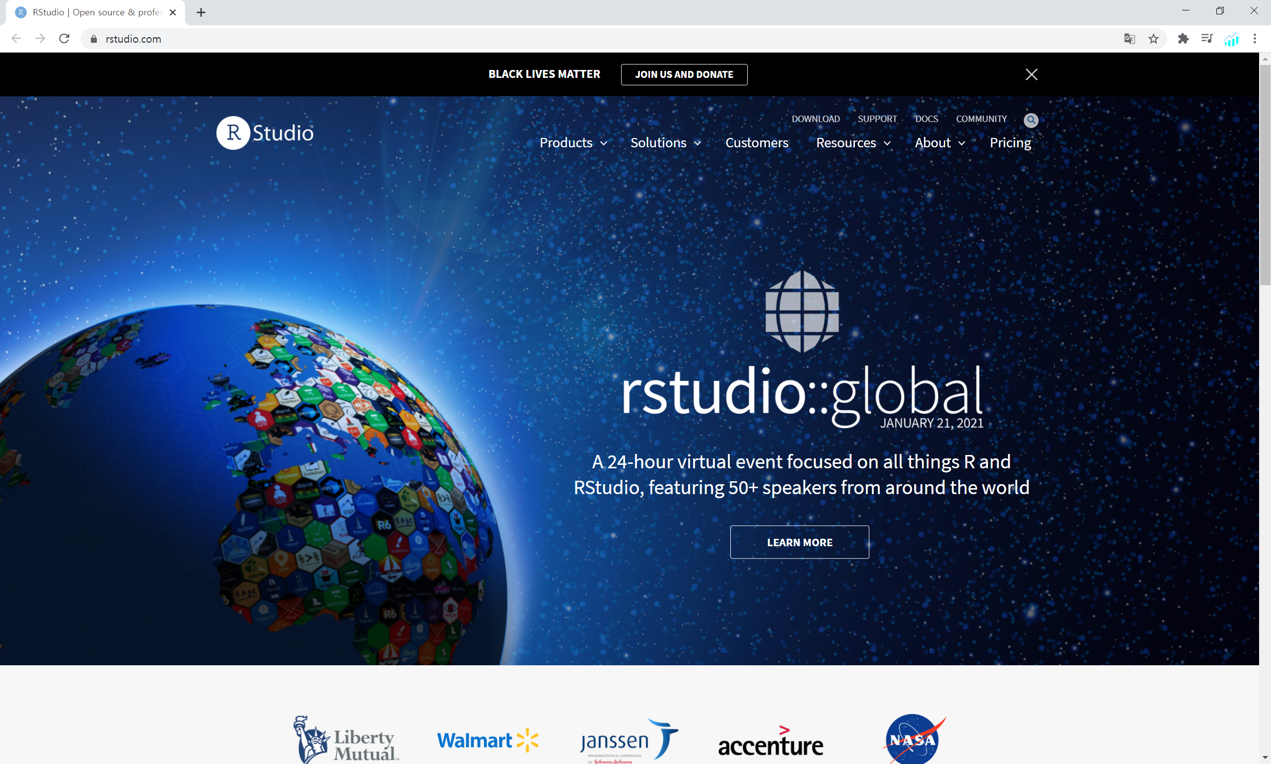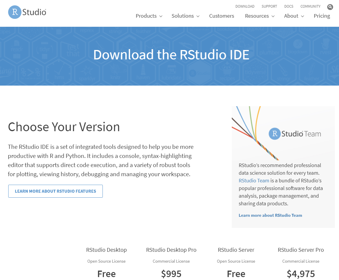 RGui를 이용해서 데이터를 분석하기엔 불편한 부분들이 존재합니다. 이러한 점 을 보완해주는 ‘R 스튜디오(RStudio)’는 데이터 분석가를 위한 편리한 기능을 한곳에 모아서 사용할 수 있도록 구성한 통합 개발 환경(Integrated Development Environ- ment)입니다. R 스튜디오는 공식 홈페이지에서 다운로드 할 수 있습니다.