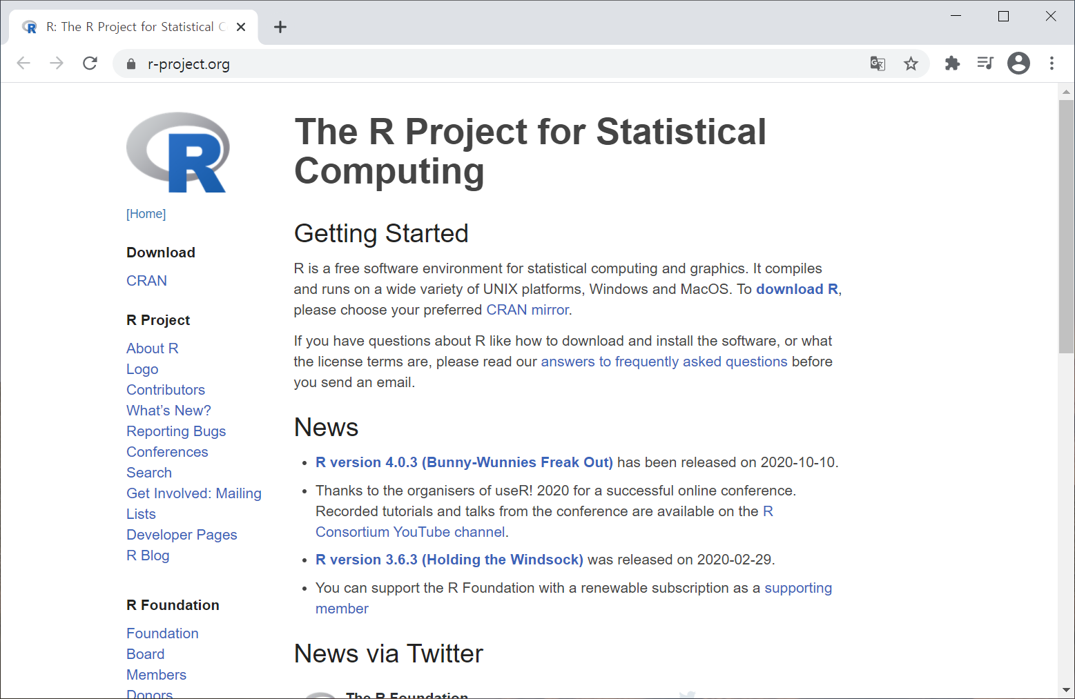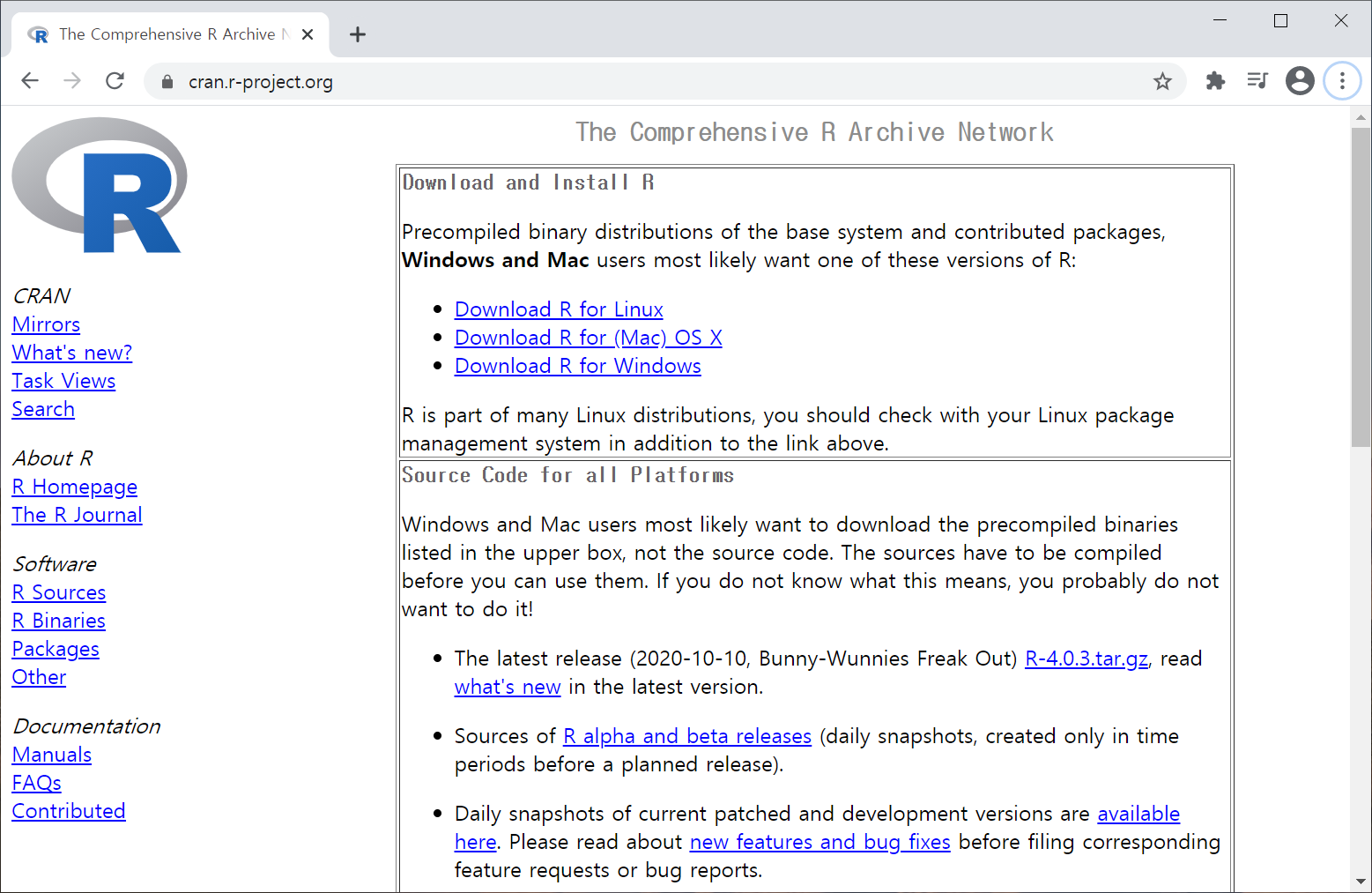 R을 사용하려면 PC에 R을 설치해야 합니다. R 공식 홈페이지에서는 관련된 최신 뉴스와 새로운 버전에 대한 릴리즈 노트를 제 공하고 있습니다. R과 관련된 최신 동향을 이해하기 위해 홈페이지에 방문하는 것 도 좋은 방법입니다.