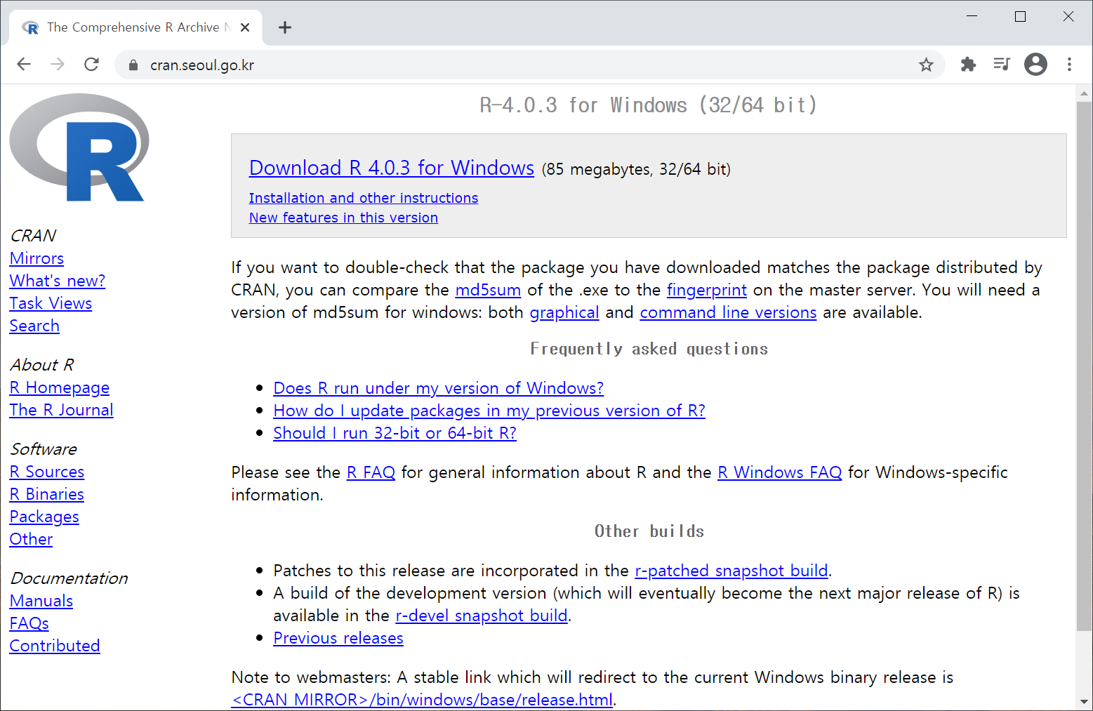 [그림 5] ‘R-x.x.x for Windows (32/64 bit)’ 페이지 R 설치하기