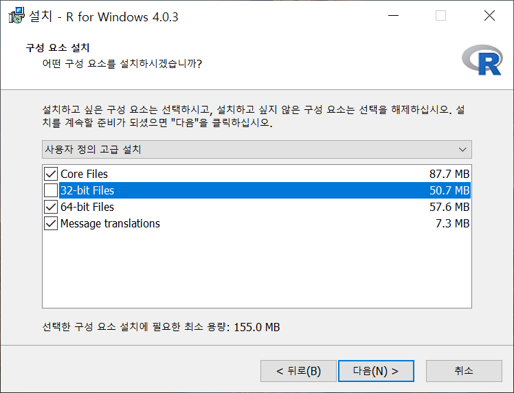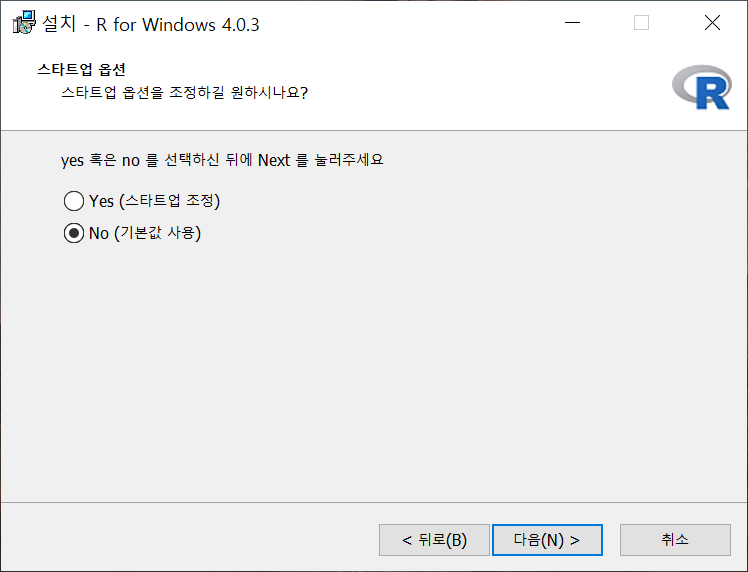 [그림 9] 설치 구성 요소 선택 화면 ④ 스타트업 옵션은 R에서 도움말을 보기 위한 기능입니다. 기본값으로 설정하고 ‘다음(N)’을 클릭하여 넘어갑니다.