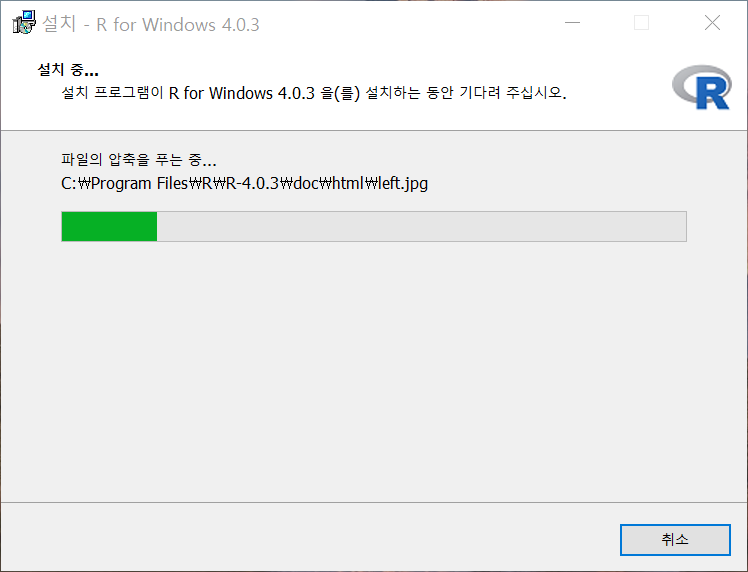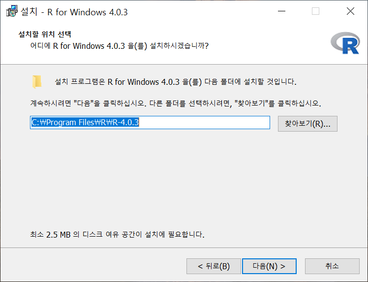 다운로드를 마친 후 설치 파일을 실행합니다. 일반적으로 다운로드 폴더를 변경하 지 않을 경우에 ‘다운로드’ 폴더에 저장되어 있으며, 파일명은 일반적으로 ‘R-x.x.x- win.exe’와 같은 형식입니다.