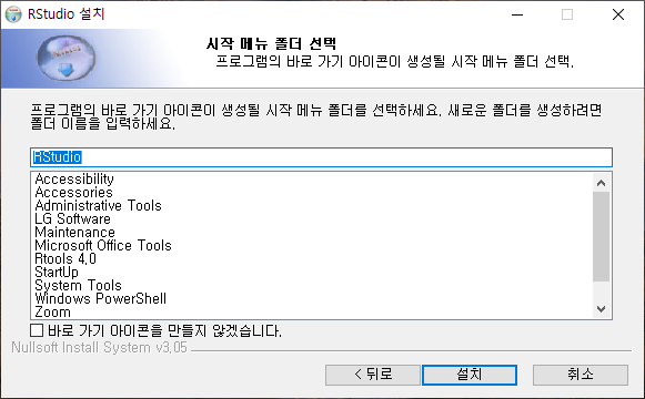 [그림 21] R 스튜디오 시작 메뉴 폴더 선택 화면 ④ 설치 진행이 완료되면 ‘RStudio 설치 완료’ 창이 나타납니다. ‘마침’을 클릭하여 창을 닫습니다.