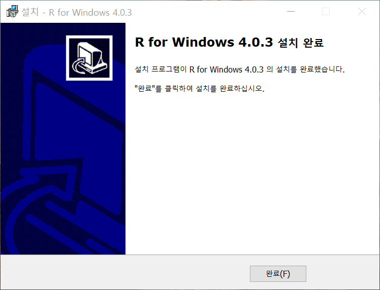 [그림 11] 추가 사항 적용 화면 ⑥ 설치 진행이 완료되면 ‘R for Windows x.x.x 설치 완료’ 창이 나타납니다. ‘완료 (F)’를 클릭하여 창을 닫습니다.