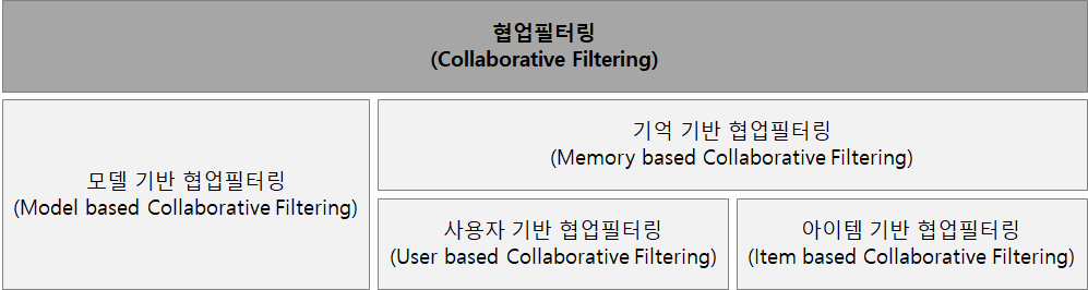 [그림 1]은 협업필터링을 이용한 추천방식으로 협업필터링은 크게 기억 기반 협업필터링과 모델 기반 협업 필터링으로 구분되며, 기억 기반 협업 필터링은 다시 사용자 기반 협업필터링과 아이템 기반 협업 필터링으로 구분한다.