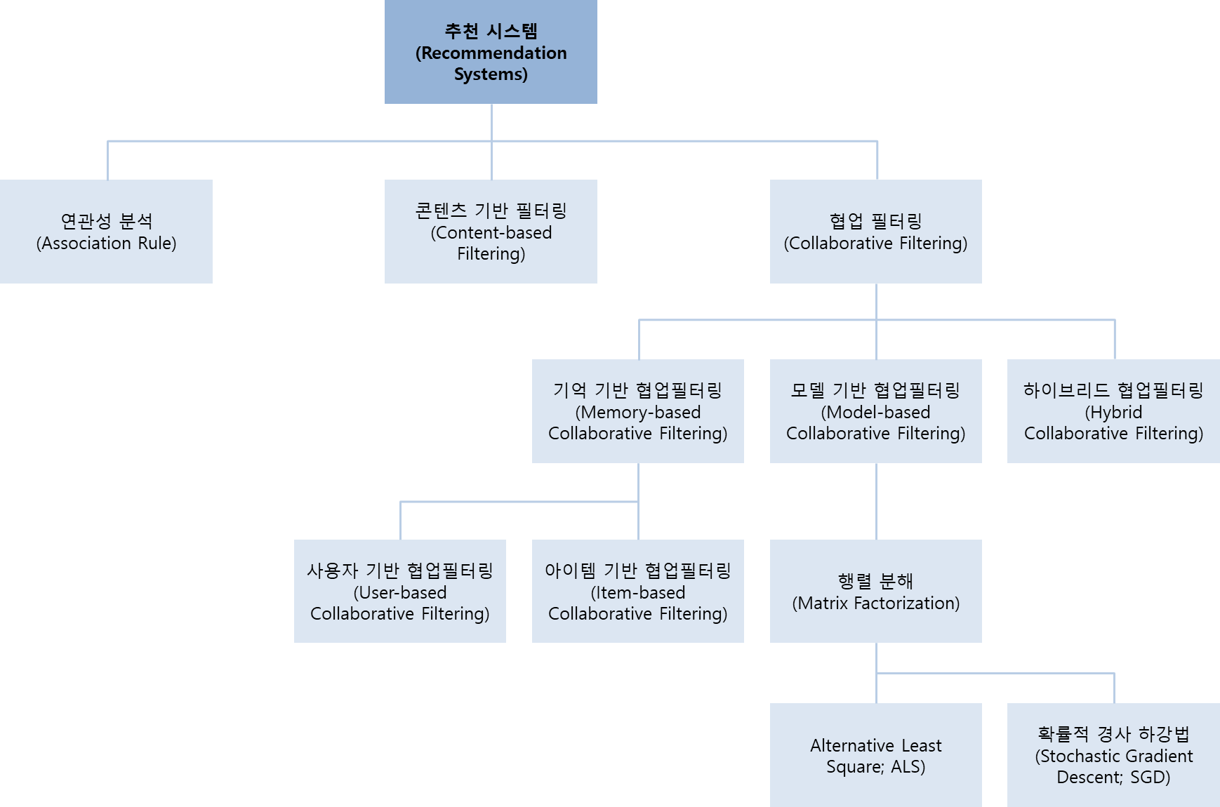 추천 시스템은 크게 3가지 알고리즘으로 구분할 수 있다. 먼저, 장바구니 분석으로 유명한 연관성 분석(Association Rule)이 있고, 콘텐츠 정보를 바탕으로 추천을 하는 콘텐츠 기반 필터링(Content-based Filtering) 그리고 콘텐츠 기반 필터링의 대안 방식이자 가장 많이 사용하는 협업필터링(Collaborative Filtering)이 있다. 협업 필터링은 접근 방식에 따라 더 상세하게 구분하고 있다. 근접 이웃을 바탕으로 하는 기억 기반 협업필터링(Memory-based Collaborative Filtering)과 잠재 요인을 바탕으로 추천하는 모델 기반 협업필터링(Model-based Collaborative Filtering) 그리고 두 접근 방식을 조합한 하이브리드 협업필터링(Hybride Collaborative Filtering)으로 구분한다.