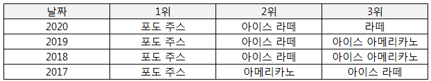 Date Type Product Price Visit Sales 2017-12-31 핫 라떼 4000 132 528000 2017-12-31 핫 아메리카노 3500 117 409500 2017-12-31 아이스 아이스 라떼 4000 145 580000 2017-12-31 아이스 아이스 아메리카노 3500 118 413000 2017-12-31 아이스 포도 주스 4500 133 598500 2017-12-31 아이스 수박 주스 5000 0 0 2018-01-31 핫 라떼 4000 150 600000 2018-01-31 핫 아메리카노 3500 121 423500 2018-01-31 아이스 아이스 라떼 4000 123 492000 2018-01-31 아이스 아이스 아메리카노 3500 111 388500 2018-01-31 아이스 포도 주스 4500 146 657000 2018-01-31 아이스 수박 주스 5000 0 0 상위 아이템 표시하기