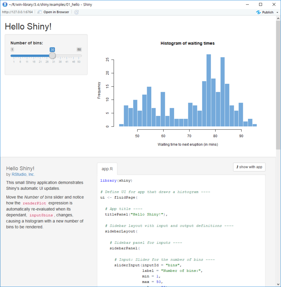 runExample("01_hello") # a histogram runExample("02_text") # tables and data frames runExample("03_reactivity") # a reactive expression runExample("04_mpg") # global variables runExample("05_sliders") # slider bars runExample("06_tabsets") # tabbed panels runExample("07_widgets") # help text and submit buttons runExample("08_html") # Shiny app built from HTML runExample("09_upload") # file upload wizard runExample("10_download") # file download wizard runExample("11_timer") # an automated timerReference