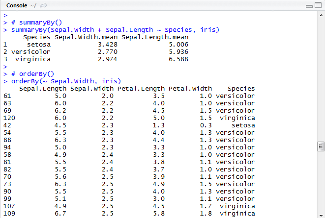[그림 1-2] summaryBy(), orderBy() 실습 화면 Reference