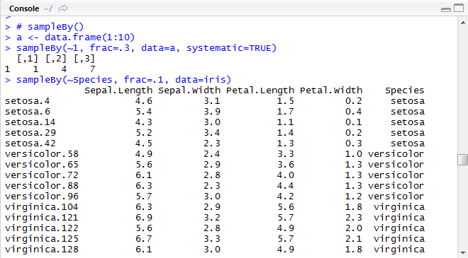 # doBy package install.packages("doBy") library(doBy) # sampleBy() sample = data.frame(1:10) sampleBy(~1, frac=.3, data=sample, systematic=TRUE) sampleBy(~Species, frac=.1, data=iris) # summaryBy() summaryBy(Sepal.Width + Sepal.Length ~ Species, iris) # orderBy() orderBy(~ Sepal.Width, iris)sampleBy()의 경우는 데이터에서 표본을 추출할 때 사용하는 함수입니다. 이때, systematic=TRUE로 하셨을 경우에 계통추출법을 이용할 수 있습니다.