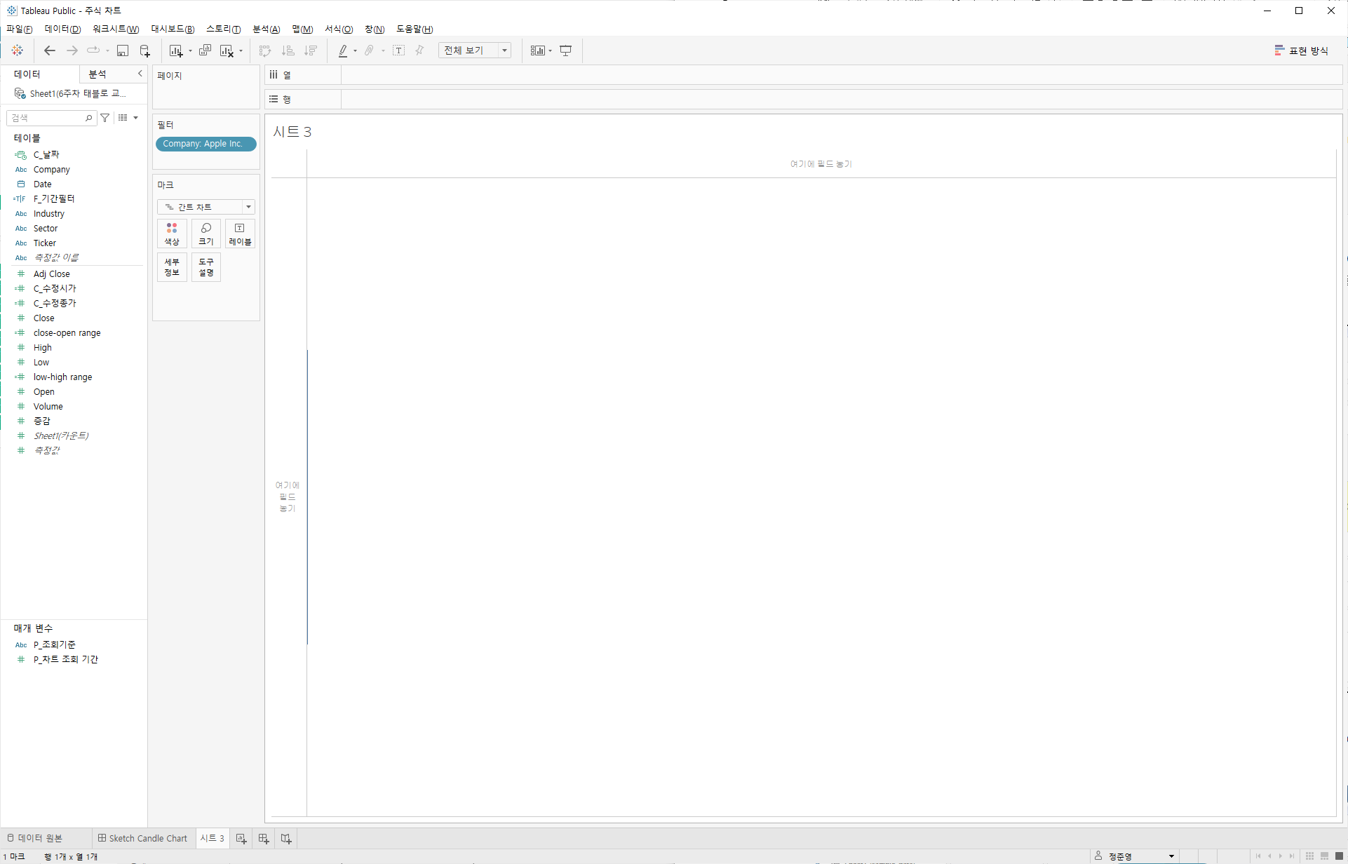 [그림 3] 필터에 Company를 얹어놓음 5. 생성된 F_기간필터를 필터 패널로 옮기고, 참 인 경우만 필터를 하면 사용자가 P_조회기준과 P_차트 조회 기간이라는 매개 변수를 입력할때마다 화면에 노출되는 주식 정보를 변경하면서 조회할 수 있다.