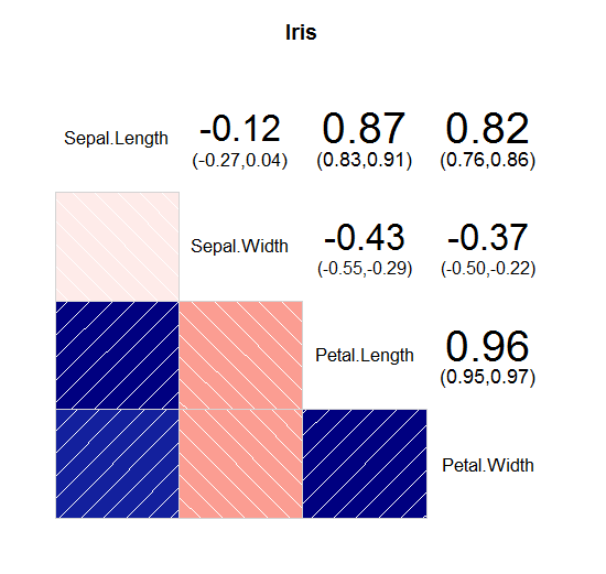 install.packages("corrgram") library(corrgram) corrgram::corrgram(iris[,1:4], main="Iris", upper.panel = panel.conf)