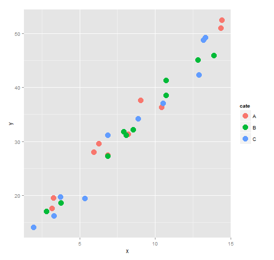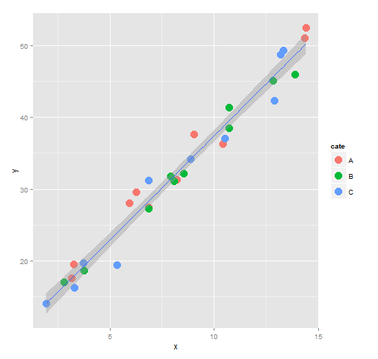 geom_point(aes(color = cate), size = 5) geom_point(aes(color = cate), size = 5) + geom_smooth("lm") Reference