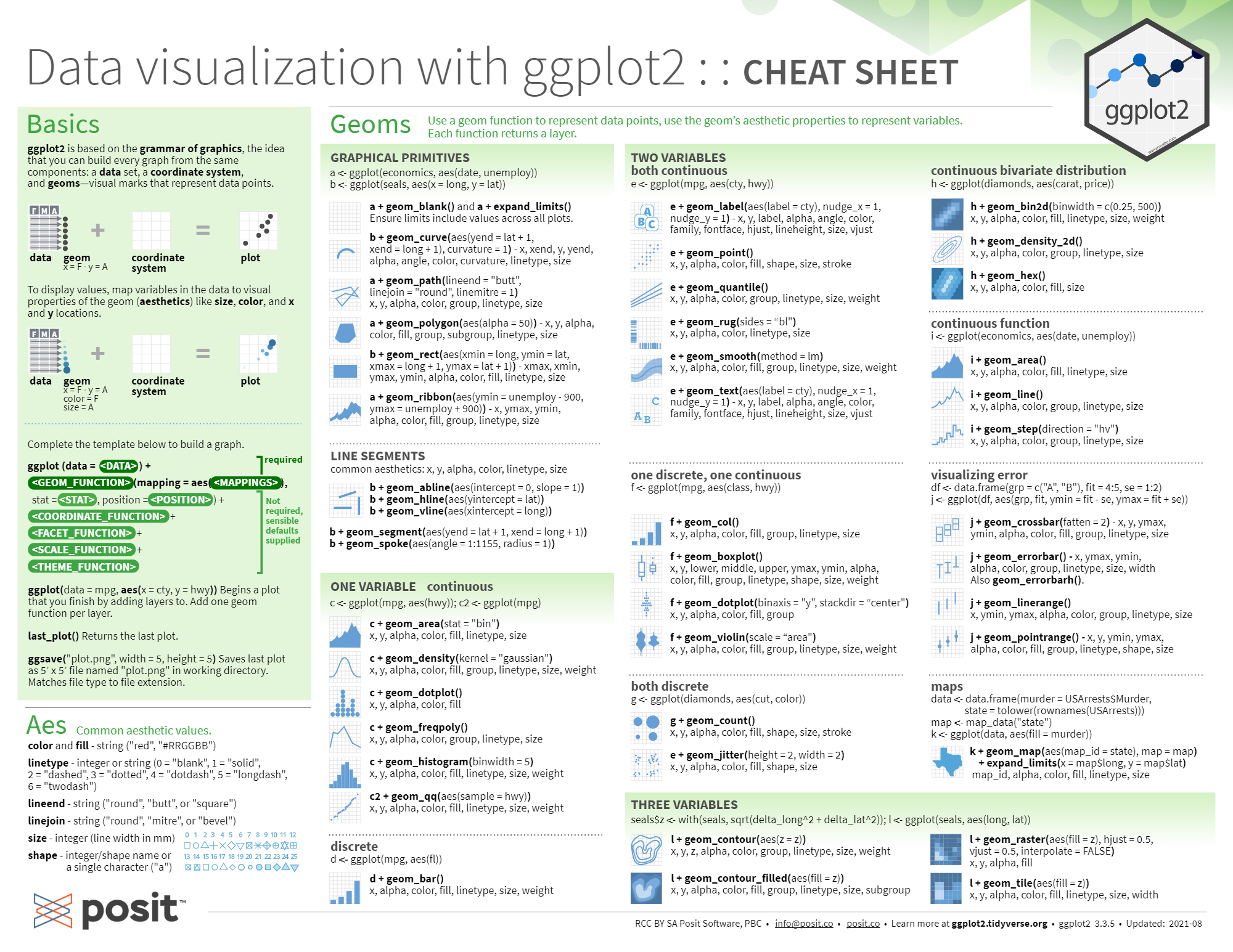 데이터 시각화는 https://jaydata.tistory.com/58에서 계속 강조하였다. R에서는 데이터를 시각화하기 위한 기본 함수도 존재하지만 tidyverse 생태계 구축 이후로 ggplot2에 대한 활용이 좀 더 늘어났다. ggplot2를 쉽게 사용하기 위해 Cheatsheet까지 제공하고 있다는 점에서 편의성을 제공하고 있다.