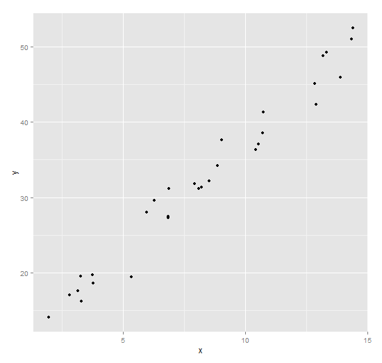 install.packages("ggplot2") library(ggplot2) # Sample Dataset cate = rep(c("A", "B", "C"), each=10) x = runif(30, 1, 15) y = 7 + 3*x + rnorm(30, 0, 2) pdata = data.frame(cate, x, y) # 산점도 시각화 p = ggplot(pdata, aes(x,y)) p + geom_point() p + geom_point(size=5) p + geom_point(aes(color=cate), size=5) p + geom_point(aes(color=cate), size=5)+geom_smooth(method="lm")