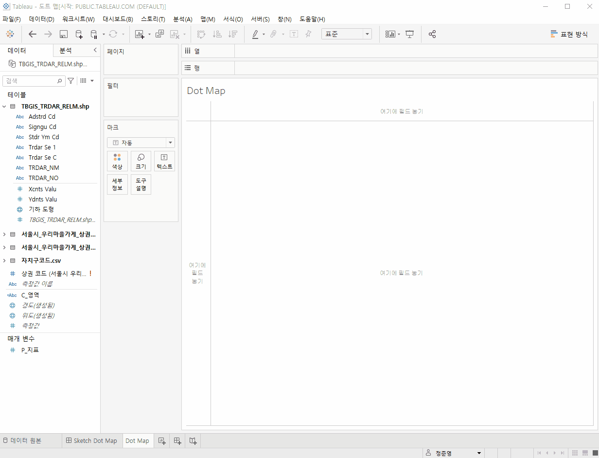 3. 도트맵을 구성하기 위해 shape 파일을 불러오면 데이터 패널에 '기하 도형'이 생성되고 더블클릭하면 열 패널과 행 패널에 경도와 위도가 표현이 된다. 지도에서 지역상권까지 표현하기 위해서 상권이름인 'TRDAR_NM'을 세부정보로 옮겨 놓고 지역상권이 어떤 분류를 갖고 있는지 확인하기 위해 상권구분 정보인 'Trdar Se 1'을 색상으로 옮기면 도트맵 표현이 가능하다.