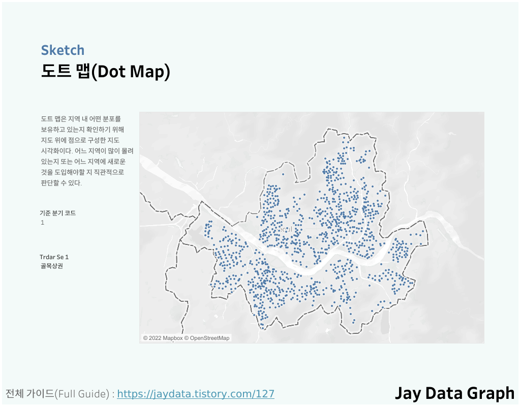 도트맵(Dot Map)는 지도 위에 존재하는 특정 좌표에 대한 현황을 한 눈에 확인할 수 있는 시각화이다. 즉, 이 점을 바탕으로 지도 내의 분포도 확인할 수 있다는 장점이 있다. Severino Ribecca는 <그림 1>과 같이 도트맵의 정의를 구체적으로 제시하며, 지표를 시각화를 한다.
