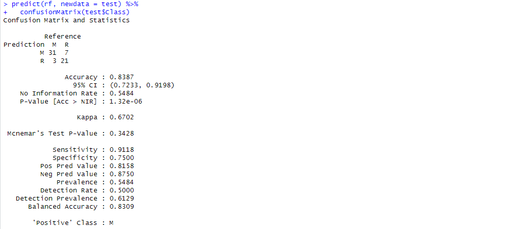install.packages("caret") library(caret) library(mlbench) set.seed(0214) data(Sonar) Sonar = Sonar index = sample(1:nrow(Sonar), round(nrow(Sonar)*0.7)) train = Sonar[index,] test = Sonar[-index,] fitCon = trainControl(method = "repeatedcv", number = 5, repeats = 3) rf = train(Class ~ ., data = train, method = "rf", trControl = fitCon, verbose = F) predict(rf, newdata = test) %>% confusionMatrix(test$Class)