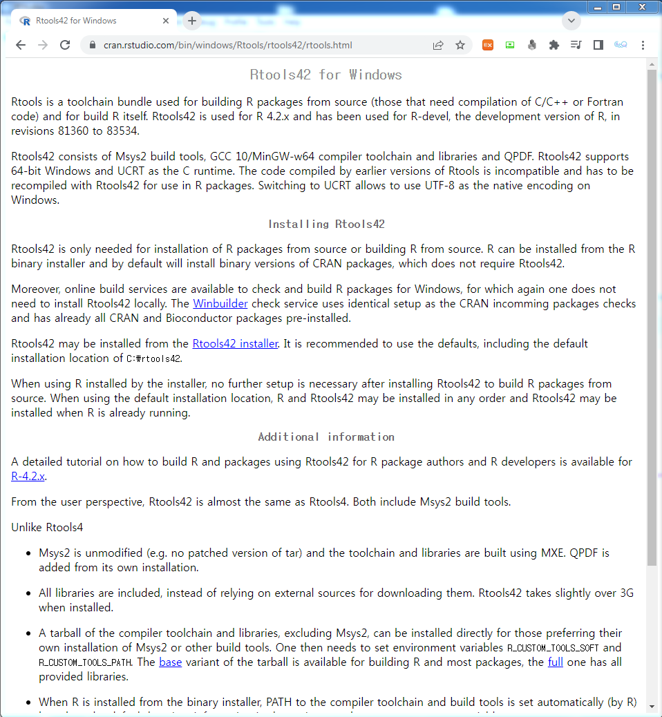 [그림 2] Rtools 설치 URL 해당 버전을 클릭하면 Rtools42 for Windows 페이지가 나타나며, 주간에 Installing Rtools42 제목에 Rtools42 installer가 파란색 밑줄로 나타나 있는 것을 확인할 수 있다. 이 것을 클릭하면 설치 파일을 다운로드 할 수 있다.
