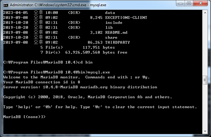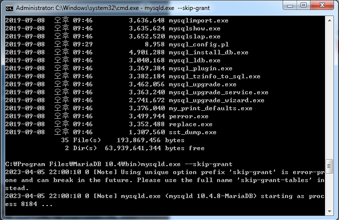 [그림 3] 경로 이동 및 재시작(--skip-grant 옵션) 4. 새로운 커맨드 창을 열어 MariaDB가 설치된 경로로 이동하여 mysql.exe를 실행시킨다.