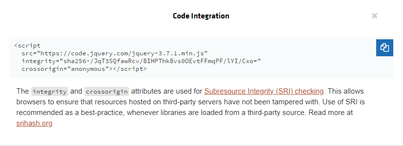 jQuery 홈페이지에서 CDN 페이지에 접속하면 최근에 릴리즈된 3.7.1(2023년 10월 16일 기준)의 CND을 확인할 수 있다.