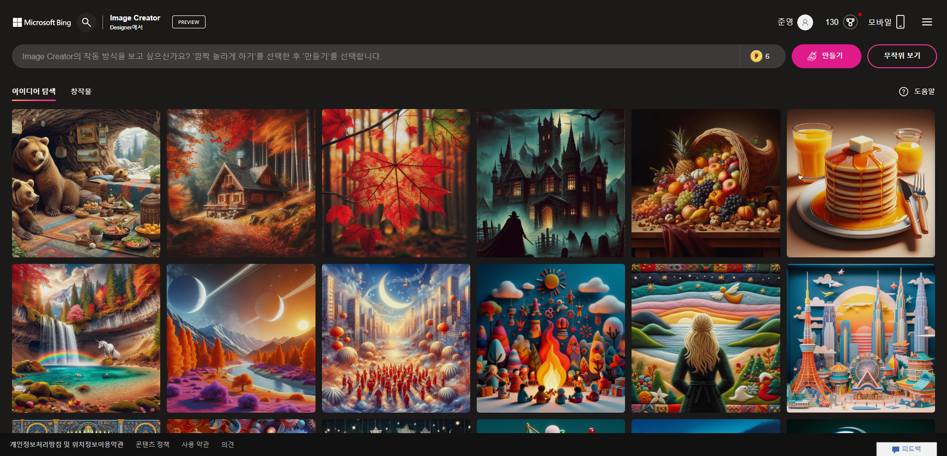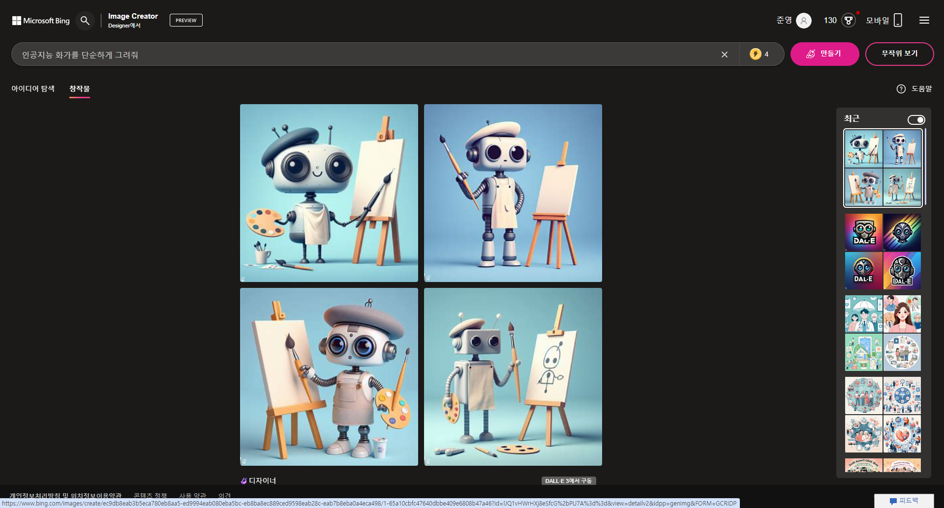 [그림 2] Microsoft Bing의 Image Creator DALL-E는 다양한 주제와 스타일에 따른 이미지 생성 능력을 갖추고 있습니다. 예를 들어, "새로운 종류의 고양이"나 "프랑스어로 설명된 투명한 옷을 입은 사람"과 같은 특이하고 창의적인 이미지를 생성할 수 있습니다. [그림 3]은 "인공지능 화가를 단순하게 그려줘"라고 입력했을 때 나타나는 이미지이다.