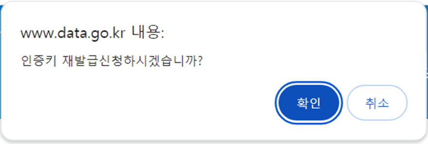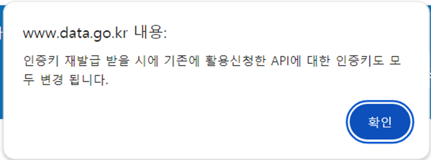 3. 이후에 나타나는 팝업창에서 확인 버튼을 누르고 인증키 재발급을 하겠냐고 물어보는 질문에 확인을 누르면 인증키가 새로 발급 받은 것을 볼 수 있다.