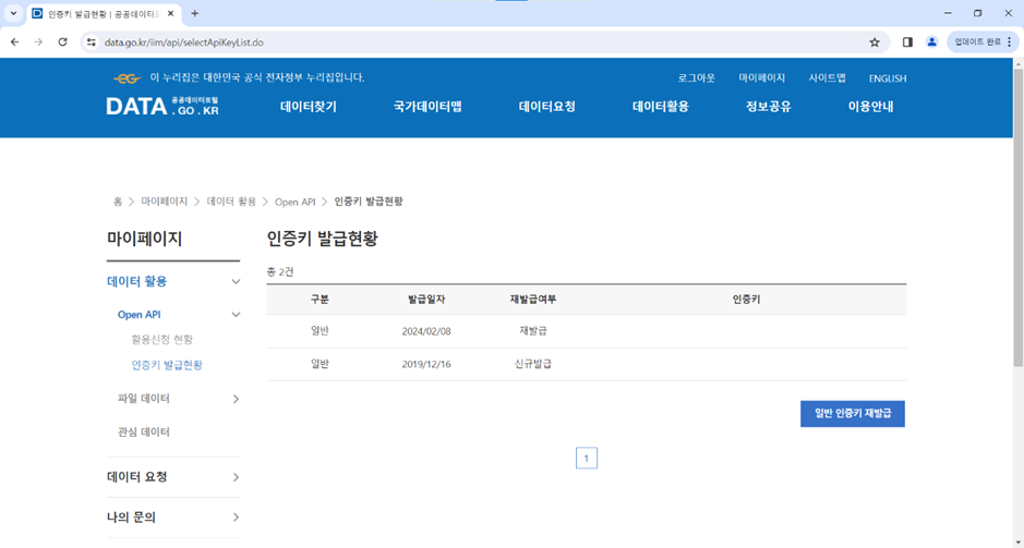 2. 하단의 일반 인증키 재발급을 누른다