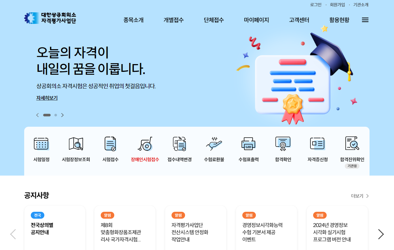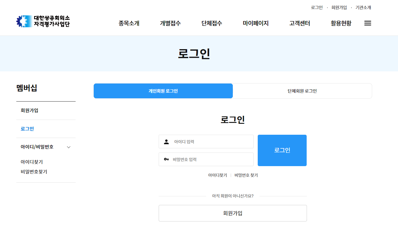 대한상공회의소 홈페이지(https://license.korcham.net/indexmain.jsp)에서 접수가 가능하다. 상단에 있는 개별접수를 들어가면 로그인 하여 접수 할 수 있다. 원서 접수 응시 종목을 선택하고 다음을 눌러 접수를 진행할 수 있다.