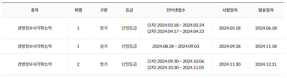 2024년 5월 18일 제 1회 경영정보시각화능력 국가기술자격 시험이 진행될 예정이다. 현재 경영정보시각화능력 1회 필기 시험이 1차 접수중인데 24년 3월 24일까지 1차 접수를 마감하고 4월 17일부터 4월 23일까지 2차 접수를 진행한다고 한다. 예정된 일정만 보면 일단 5월에 1회 필기 9월에 1회 실기 그리고 11월에 2회 필기가 진행될 예정이라고 한다.