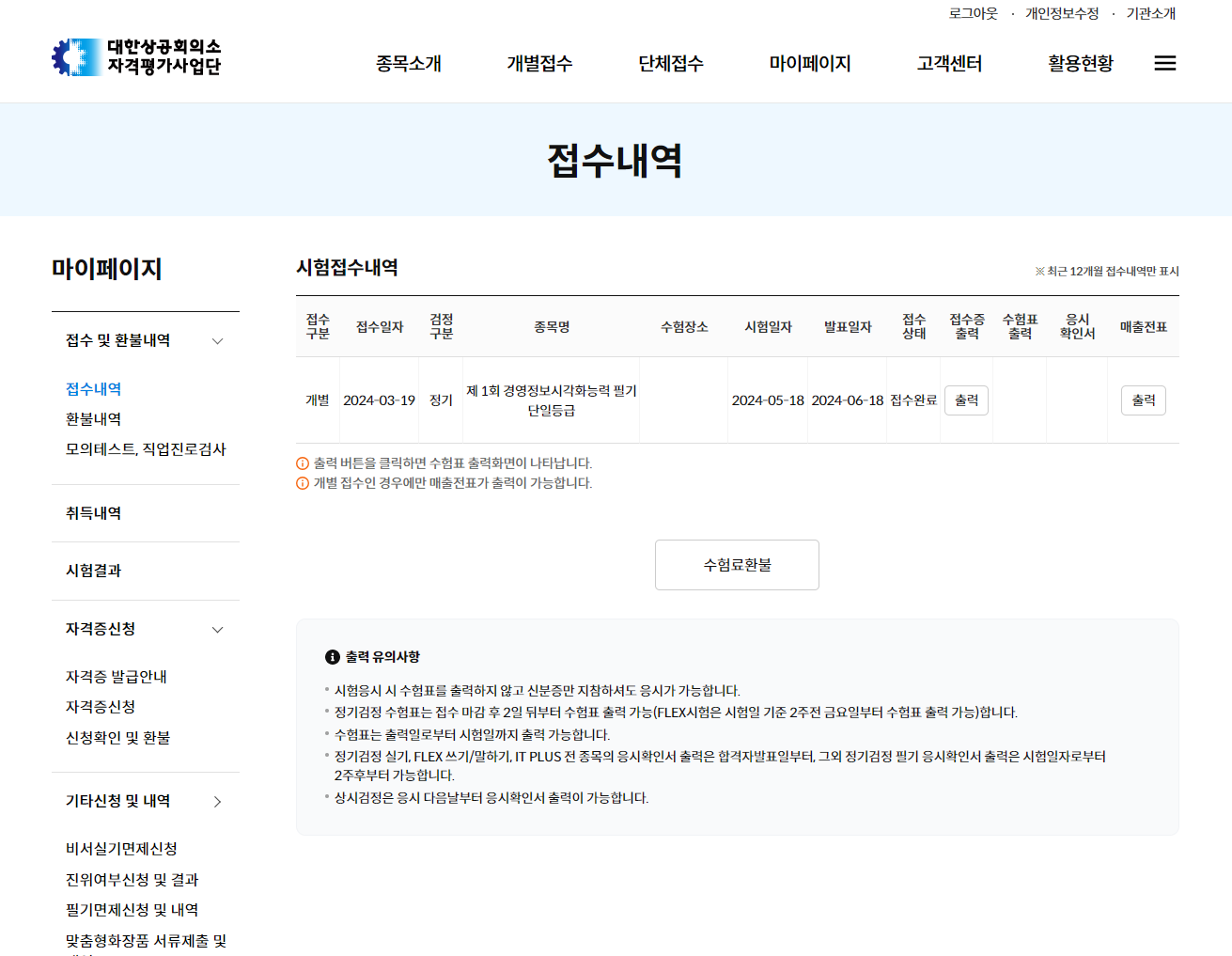 마이페이지 들어가면 접수 내역을 조회할 수 있다. 시험응시 때 수험표 없이 신분증만 있어도 응시가 가능하다고 하기 때문에 수험장소에 잘 다녀오면 된다.