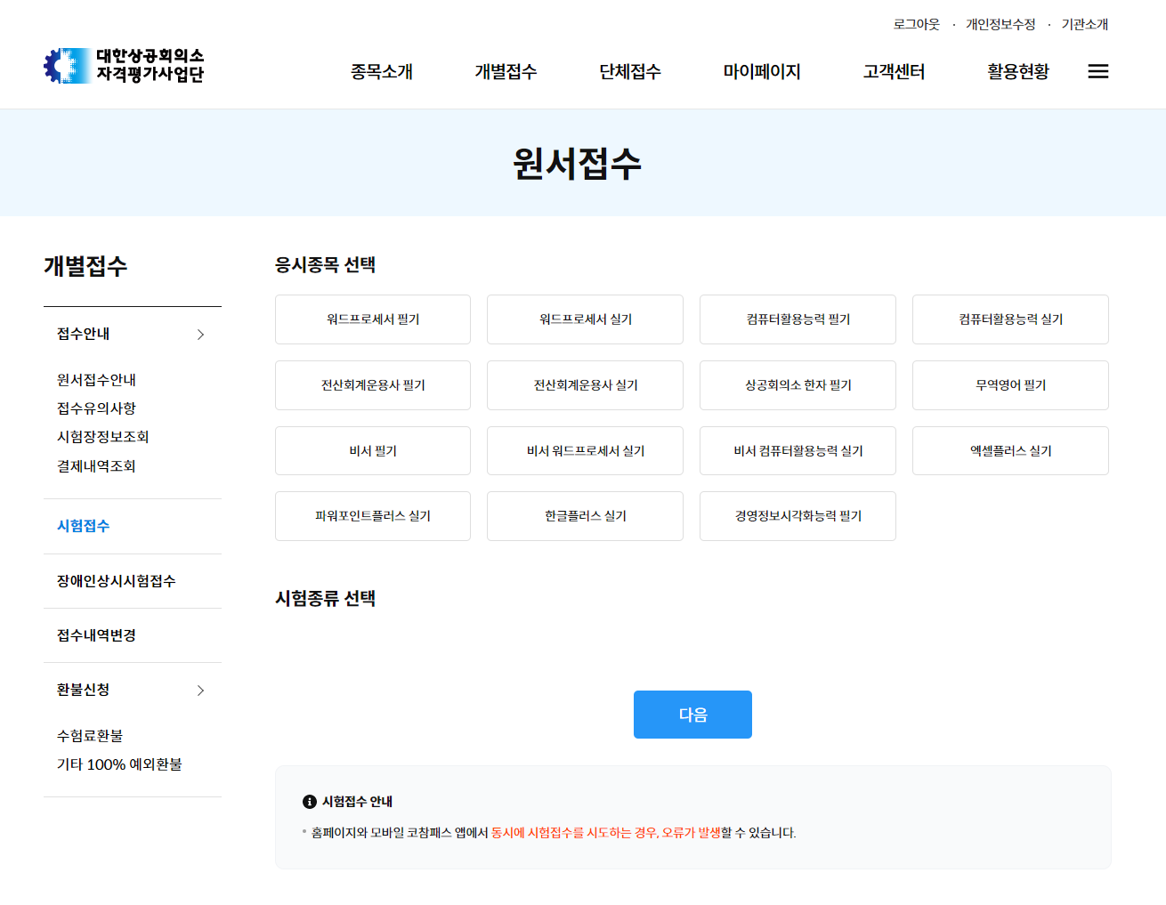 대한상공회의소 홈페이지(https://license.korcham.net/indexmain.jsp)에서 접수가 가능하다. 상단에 있는 개별접수를 들어가면 로그인 하여 접수 할 수 있다. 원서 접수 응시 종목을 선택하고 다음을 눌러 접수를 진행할 수 있다.