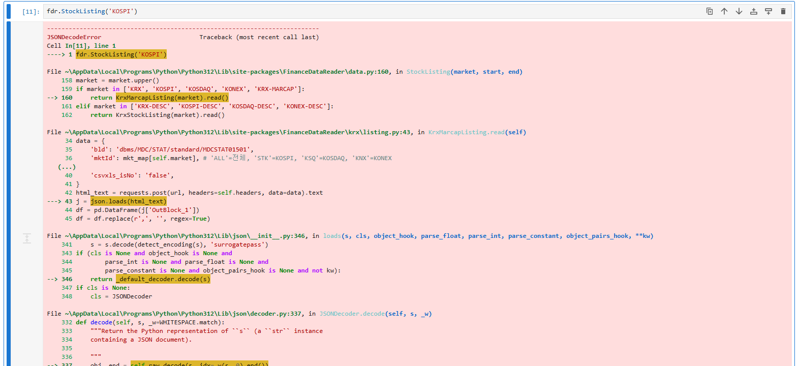 import FinanceDataReader as fdr fdr.StockListing('KOSPI') --------------------------------------------------------------------------- JSONDecodeError Traceback (most recent call last) Cell In[11], line 1 ----> 1 fdr.StockListing('KOSPI') File ~\AppData\Local\Programs\Python\Python312\Lib\site-packages\FinanceDataReader\data.py:160, in StockListing(market, start, end) 158 market = market.upper() 159 if market in ['KRX', 'KOSPI', 'KOSDAQ', 'KONEX', 'KRX-MARCAP']: --> 160 return KrxMarcapListing(market).read() 161 elif market in ['KRX-DESC', 'KOSPI-DESC', 'KOSDAQ-DESC', 'KONEX-DESC']: 162 return KrxStockListing(market).read() File ~\AppData\Local\Programs\Python\Python312\Lib\site-packages\FinanceDataReader\krx\listing.py:43, in KrxMarcapListing.read(self) 34 data = { 35 'bld': 'dbms/MDC/STAT/standard/MDCSTAT01501', 36 'mktId': mkt_map[self.market], # 'ALL'=전체, 'STK'=KOSPI, 'KSQ'=KOSDAQ, 'KNX'=KONEX (...) 40 'csvxls_isNo': 'false', 41 } 42 html_text = requests.post(url, headers=self.headers, data=data).text ---> 43 j = json.loads(html_text) 44 df = pd.DataFrame(j['OutBlock_1']) 45 df = df.replace(r',', '', regex=True) File ~\AppData\Local\Programs\Python\Python312\Lib\json\__init__.py:346, in loads(s, cls, object_hook, parse_float, parse_int, parse_constant, object_pairs_hook, **kw) 341 s = s.decode(detect_encoding(s), 'surrogatepass') 343 if (cls is None and object_hook is None and 344 parse_int is None and parse_float is None and 345 parse_constant is None and object_pairs_hook is None and not kw): --> 346 return _default_decoder.decode(s) 347 if cls is None: 348 cls = JSONDecoder File ~\AppData\Local\Programs\Python\Python312\Lib\json\decoder.py:337, in JSONDecoder.decode(self, s, _w) 332 def decode(self, s, _w=WHITESPACE.match): 333 """Return the Python representation of ``s`` (a ``str`` instance 334 containing a JSON document). 335 336 """ --> 337 obj, end = self.raw_decode(s, idx=_w(s, 0).end()) 338 end = _w(s, end).end() 339 if end != len(s): File ~\AppData\Local\Programs\Python\Python312\Lib\json\decoder.py:355, in JSONDecoder.raw_decode(self, s, idx) 353 obj, end = self.scan_once(s, idx) 354 except StopIteration as err: --> 355 raise JSONDecodeError("Expecting value", s, err.value) from None 356 return obj, end JSONDecodeError: Expecting value: line 1 column 1 (char 0)조치 방법