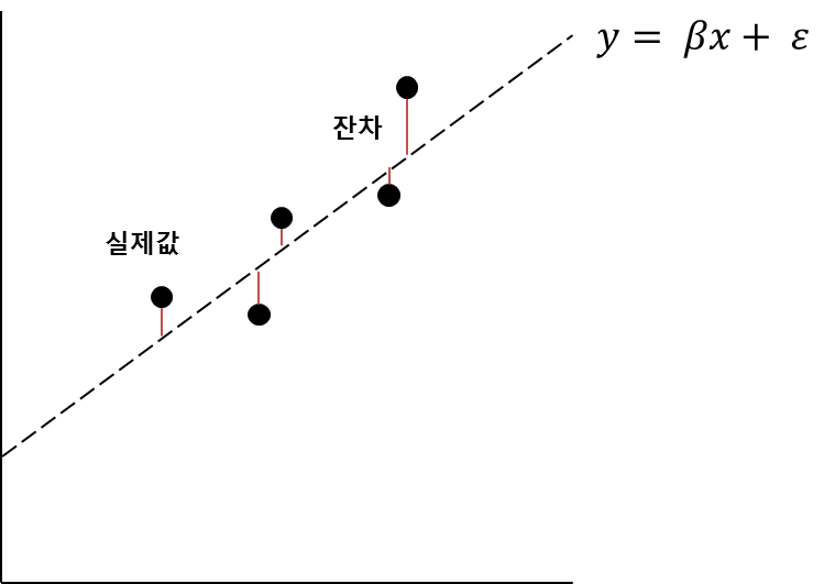 종속변수 y와 독립변수 x 간의 관계를 수식으로 표현하면 다음과 같이 표현 할 수 있다. 이때, 단순선형회귀분석에서 최적의 선형 관계를 파악하기 위해 최소제곱법(Least Sqaures Method)를 사용한다. x와 y의 관계를 나타내는 여러 1차 방정식들 중에서 잔차(residual)을 최소화 하는 회귀계수(Regression Coefficient)를 추정한다.