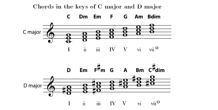 <그림 3> Chords in the keys of C major and D major 화음(Chord) 적용하기
