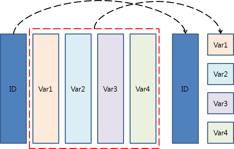 데이터의 구조를 쉽게 변형하기 위해서 melt()함수를 활용하여 손쉽게 변형할 수 있는데, 이 함수는 reshape2 패키지에 담겨있다. <그림 2>의 그림을 살펴보면 melt()함수를 이해하기 쉬울 것이다. 이는 [표 1]을 [표 2]로 쉽게 변형 할 수 있으며, 반대의 경우 cast()함수를 사용할 수 있다.