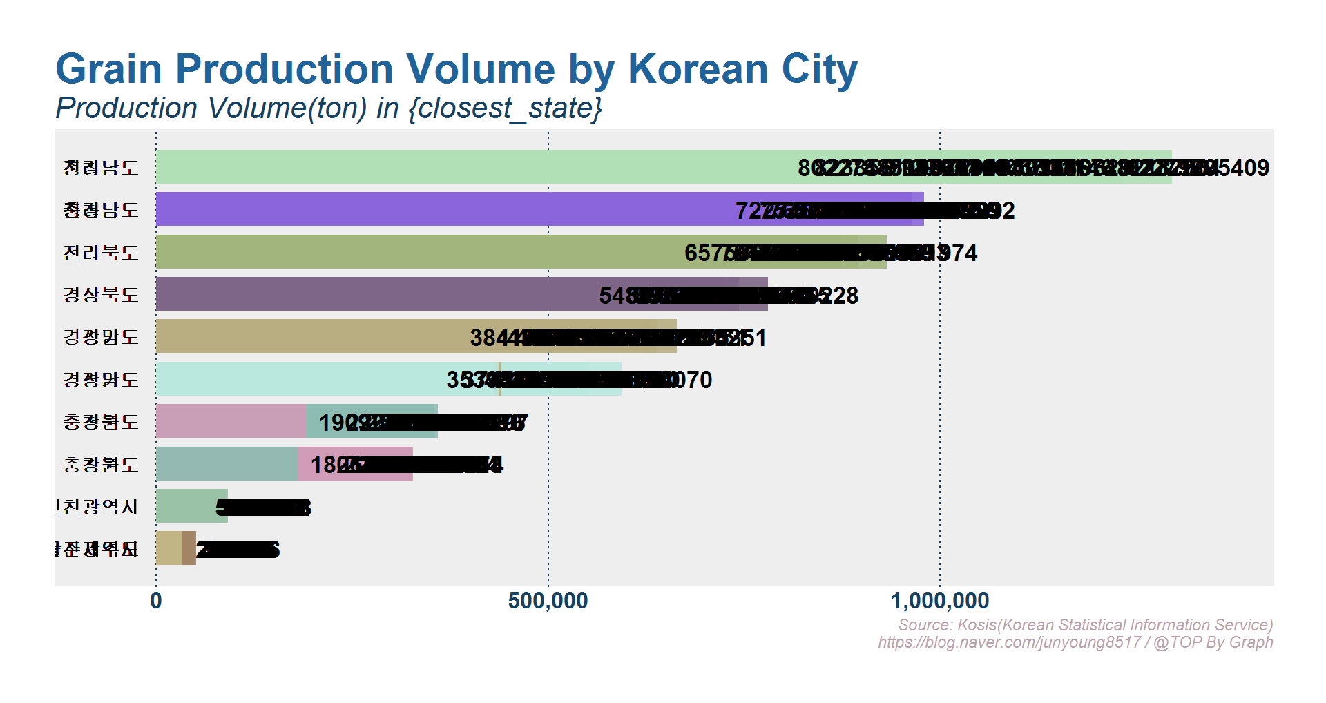 total = total %>% group_by(year) %>% arrange(year, desc(index)) %>% mutate(rank = order(index, decreasing = T)) data = subset.data.frame(total, rank <= 10, stringAsFactor = F) p = ggplot(data, aes(y = rank), color = region) + geom_tile(aes(x = index/2, height = 0.8, width = index, fill = region), alpha = 0.9) + # geom_image(aes(x = index, image = paste0("http:",url1)), # hjust = 1, # size = 0.05) + geom_text(aes(x = -1, label = paste(region, " ")), vjust = 0.5, hjust = 1, size = 7, fontface='bold', family = "jua") + geom_text(aes(x = index, label = paste0(" ",format(index,digits = 3)), hjust = 0,vjust=0.5), size = 9, fontface='bold') + scale_y_reverse() + scale_x_continuous("",labels = scales::comma, expand = c(0.1,0)) + scale_fill_manual(values = cols, aesthetics = c("colour", "fill")) + guides(color = F)앞선 과정을 거쳐서 아래와 같은 시각화를 만들 수 있다.