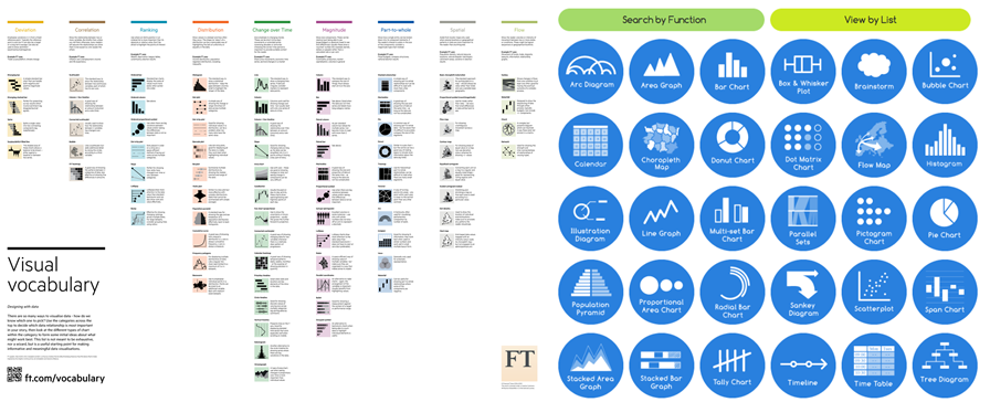 <그림 1>은 영국의 파이넨셜 타임즈(Financial Times)의 Visual Vocabulary로 파이넨셜 타임즈의 시각저널팀(Visual Journalism Team)에 의해 제안된 시각화 유형과 프리랜서 디자이너 Severino Ribecca의 The Data Visualisation Catalogue이다. 목적이나 기능에 따라 그래프를 정리한 형태이다.