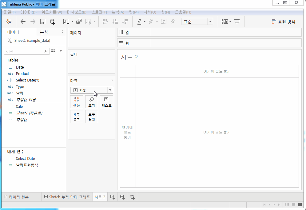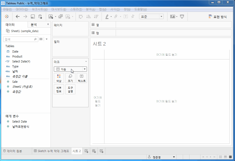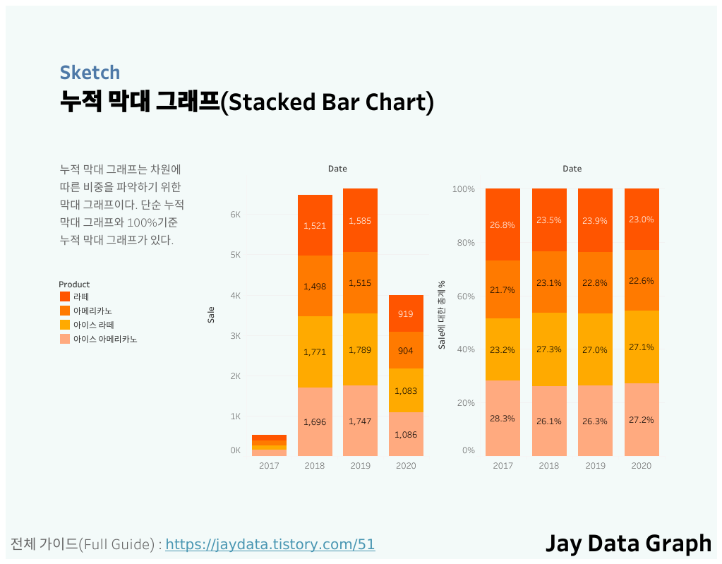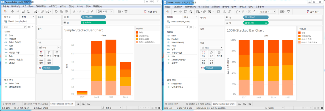 Date Type Product Sale 2017-12-31 아이스 아이스 아메리카노 125 2017-12-31 아이스 아이스 라떼 111 2017-12-31 핫 아메리카노 146 2017-12-31 핫 라떼 114 2018-01-31 아이스 아이스 아메리카노 114 2018-01-31 아이스 아이스 라떼 146 2018-01-31 핫 아메리카노 120 2018-01-31 핫 라떼 141 Tableau에서 누적 막대 그래프 시각화하기