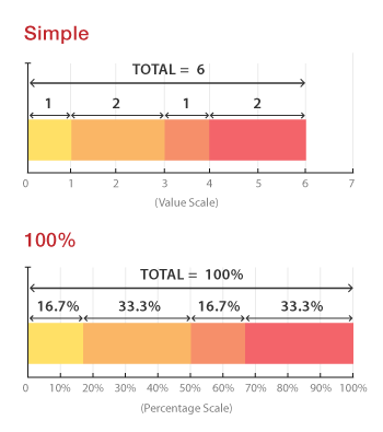 누적 막대 그래프(Stacked Bar Chart)는 파이 차트와 동일하게 일반적으로 차원별로 측정값의 비중을 보여주기 위한 목적으로 사용한다. 단, 파이 차트와는 다르게 축을 활용하여 구성비의 변화를 제공 할 수 있도록 막대 그래프를 이용하여 표현한다. Severino Ribecca는 <그림 1>과 같이 누적 막대 그래프의 정의를 구체적으로 제시하며, 단순 누적 막대 그래프(Simple Stacked Bar Chart)와 100기준 누적 막대 그래프(100% Stacked Bar Chart)로 분류한다.